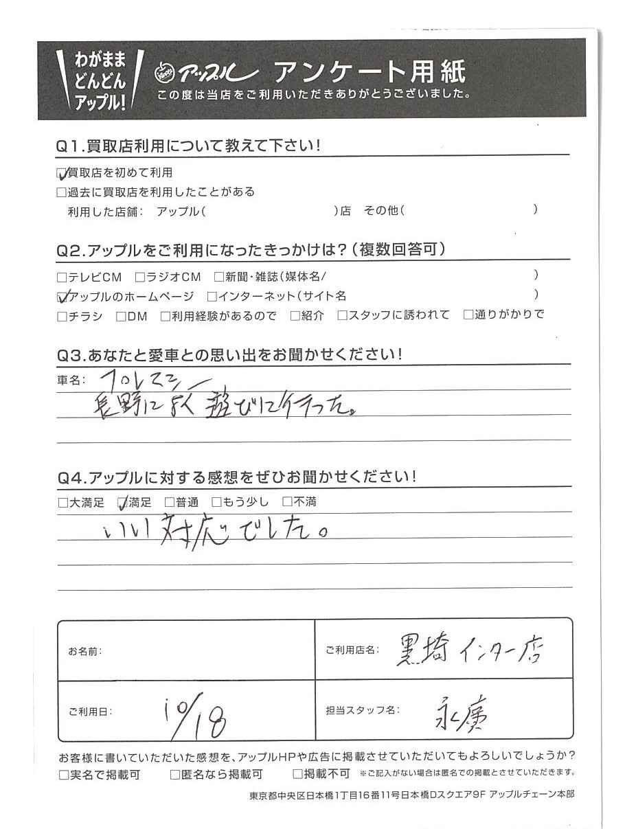 お車のご相談・ 査定だけでもOK! カンタン 入力 30秒 アップルがブランド買取始めました! お電話でも受付中! 受付時間10:00 ~ 18:30 0120-556-522 お車のご相談・ 査定だけでもOK! カンタン 入力 30秒 アップルがブランド買取始めました! お電話でも受付中! 受付時間10:00 ~ 18:30 0120-556-522 アップルがブランド買取始めました! お電話でも受付中! 受付時間10:00 ~ 18:30 0120-556-522 店舗情報 在庫車 スタッフ紹介 ブログ お客様の声 キャンペーン お得 無料査定 click お客様の声 ご記入日: 2021/10/18 新潟県新潟市 S様 車名:マツダ プレマシー Q3:あなたと愛車との思い出をお聞かせください!車名:プレマシー長野に8人遊びに行った。Q4:アップルに対する感想をぜひお聞かせください!☑満足いい対応でした。 前へ 次へ お客様の声一覧を見る