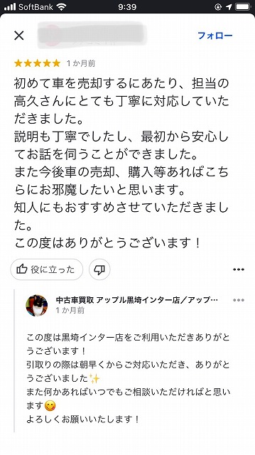 また今後車の売却、購入等があればこちらにお邪魔したいと思います。知人にもおすすめさせていただきました。