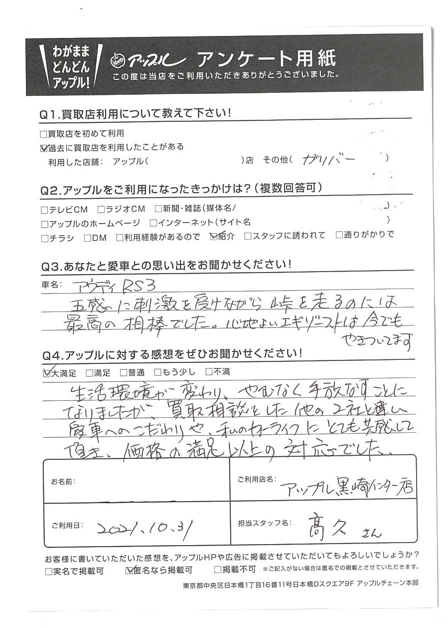新潟県新潟市 I様 車名:アウディ RS3スポーツバック