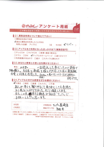 お車のご相談・ 査定だけでもOK! カンタン 入力 30秒 アップルがブランド買取始めました! お電話でも受付中! 受付時間10:00 ~ 18:30 0120-556-522 お車のご相談・ 査定だけでもOK! カンタン 入力 30秒 アップルがブランド買取始めました! お電話でも受付中! 受付時間10:00 ~ 18:30 0120-556-522 アップルがブランド買取始めました! お電話でも受付中! 受付時間10:00 ~ 18:30 0120-556-522 店舗情報 在庫車 スタッフ紹介 ブログ お客様の声 キャンペーン お得 無料査定 click お客様の声 ご記入日: 2014/06/05 H様 一目惚れした車だったので新車で7年前に購入。名古屋と新潟を嫁と付き合ってた頃に遠距離恋愛で何度も往復した。片道500㎞の道のりもハリアーだから快適に走行できた。話が早くて解りやすくて売り手としても気持ちよく売ることができました。すごく満足してます。またこの先利用する機会があればアップルでお願いしたいと思います。 前へ 次へ お客様の声一覧を見る