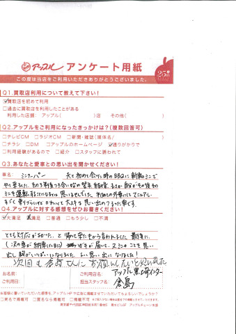 とても対応がよかった、と帰って来た夫から言われました。最後に(次の車が納車した日に)ハガキが届いて、又ミニのことを思い出し胸がいっぱいになりました。よい思い出になりました!