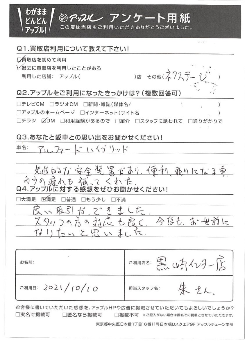 新潟県新潟市 Y様 車名:トヨタ アルファードハイブリッド(~H26年12月)