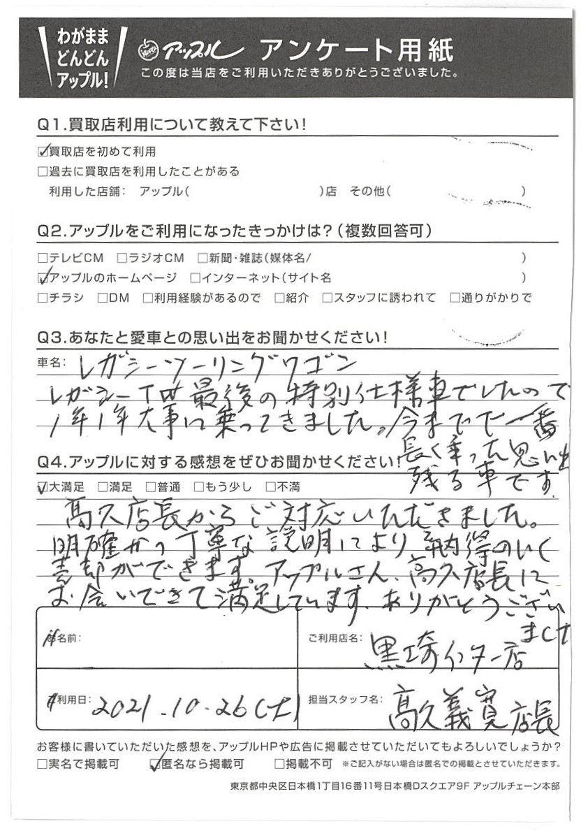新潟県新潟市 I様 車名:スバル レガシィツーリングワゴン