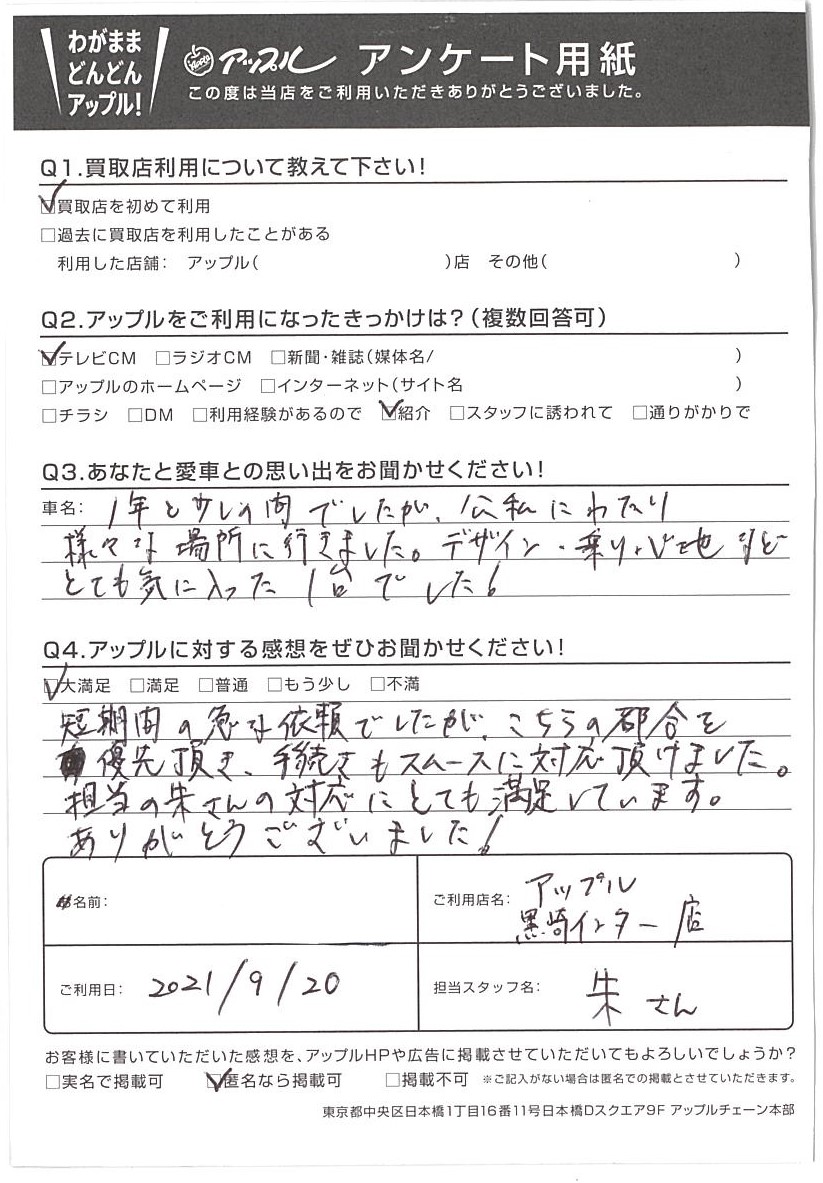 担当の朱さんの対応にとても満足しています。