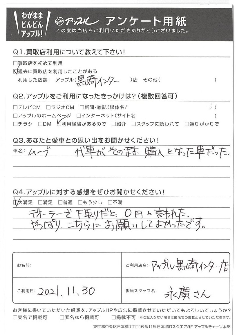 お車のご相談・ 査定だけでもOK! カンタン 入力 30秒 アップルがブランド買取始めました! お電話でも受付中! 受付時間10:00 ~ 18:30 0120-556-522 お車のご相談・ 査定だけでもOK! カンタン 入力 30秒 アップルがブランド買取始めました! お電話でも受付中! 受付時間10:00 ~ 18:30 0120-556-522 アップルがブランド買取始めました! お電話でも受付中! 受付時間10:00 ~ 18:30 0120-556-522 店舗情報 在庫車 スタッフ紹介 ブログ お客様の声 キャンペーン お得 無料査定 click お客様の声 ご記入日: 2021/11/30 新潟県新潟市 Y様 車名:ダイハツ ムーヴ Q3:あなたと愛車との思い出をお聞かせください!車名:ムーヴ代車がそのまま購入となった車だった。Q4:アップルに対する感想をぜひお聞かせください!☑大満足ディーラーで下取りだと0円と言われました。やっぱりこちらにお願いしてよかったです。 前へ 次へ お客様の声一覧を見る