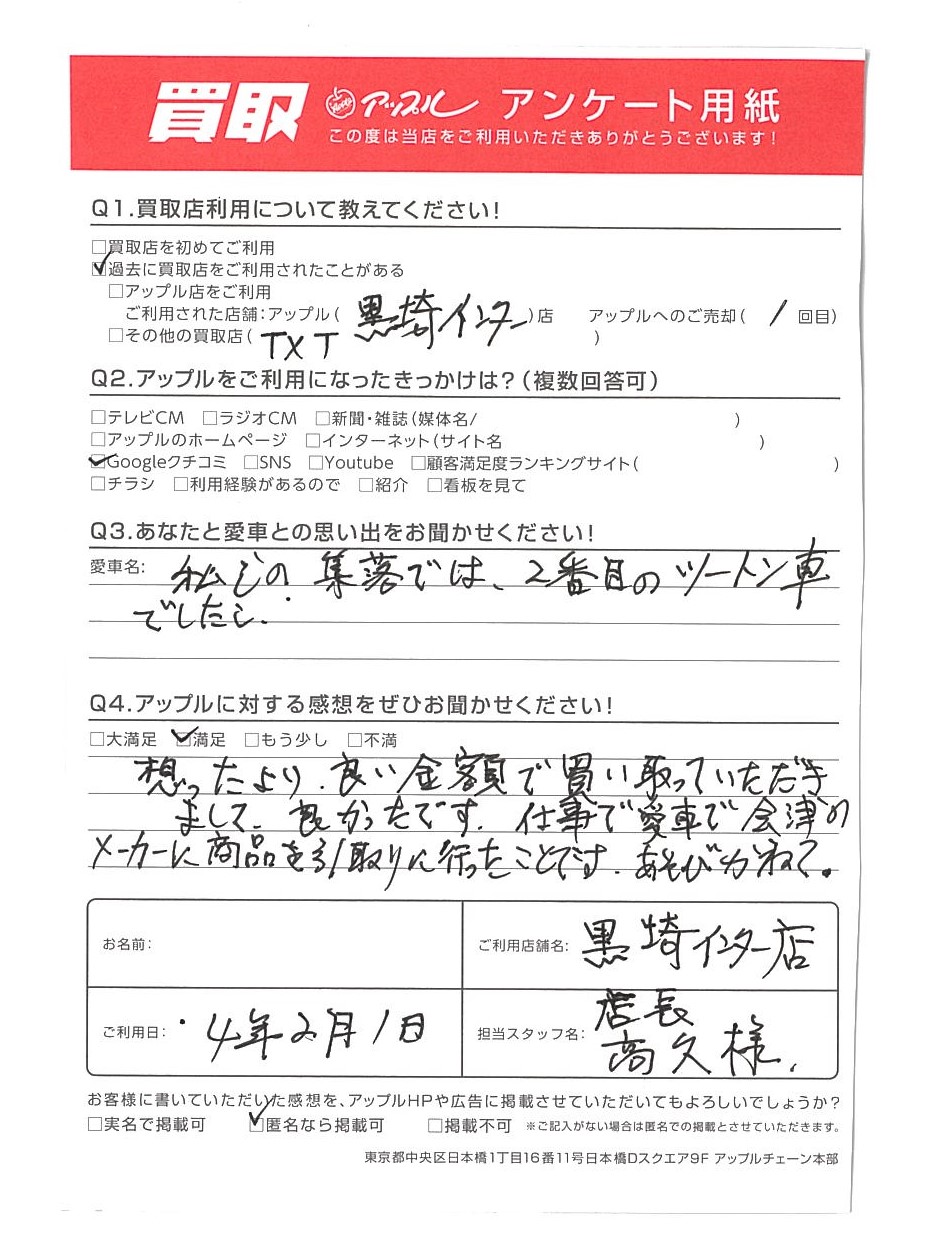 想ったより良い金額で買い取っていただきまして良かったです。