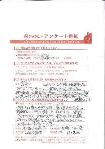 大好きな車を手放す時、車の良さを充分に理解して話を聞いていただいて値段だけでなく、大切な車を求めている方に大切に橋渡しをしてくれる対応でした。