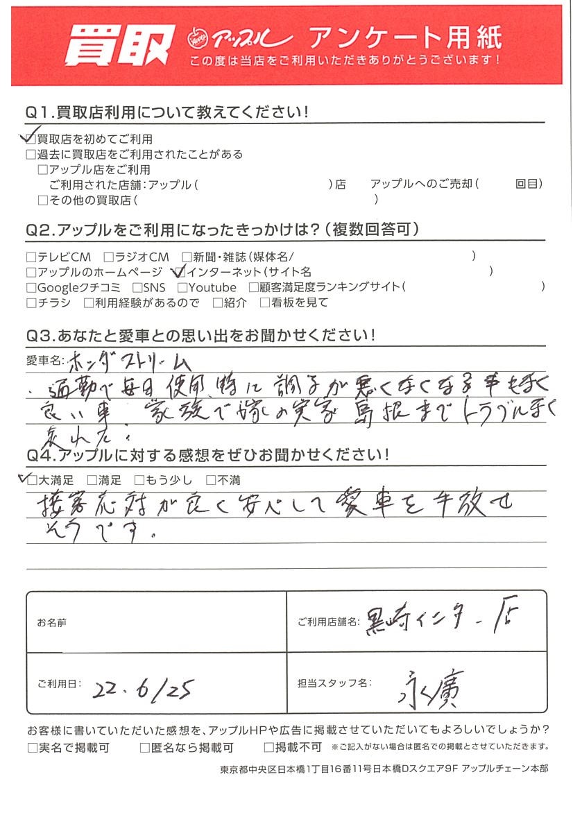 お車のご相談・ 査定だけでもOK! カンタン 入力 30秒 アップルがブランド買取始めました! お電話でも受付中! 受付時間10:00 ~ 18:30 0120-556-522 お車のご相談・ 査定だけでもOK! カンタン 入力 30秒 アップルがブランド買取始めました! お電話でも受付中! 受付時間10:00 ~ 18:30 0120-556-522 アップルがブランド買取始めました! お電話でも受付中! 受付時間10:00 ~ 18:30 0120-556-522 店舗情報 在庫車 スタッフ紹介 ブログ お客様の声 キャンペーン お得 無料査定 click お客様の声 ご記入日: 2022/06/25 新潟県新潟市 A様 車名:ホンダ ストリーム Q3.あなたと愛車との思い出をお聞かせください!通勤で毎日使用。特に調子が悪くなる事もなく良い車。家族で嫁の実家島根までトラブルなく乗れた。Q4.アップルに対する感想をぜひお聞かせください!接客対応が良くて安心して愛車を手放せそうです。 前へ 次へ お客様の声一覧を見る