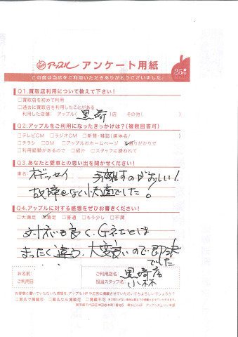 お車のご相談・ 査定だけでもOK! カンタン 入力 30秒 アップルがブランド買取始めました! お電話でも受付中! 受付時間10:00 ~ 18:30 0120-556-522 お車のご相談・ 査定だけでもOK! カンタン 入力 30秒 アップルがブランド買取始めました! お電話でも受付中! 受付時間10:00 ~ 18:30 0120-556-522 アップルがブランド買取始めました! お電話でも受付中! 受付時間10:00 ~ 18:30 0120-556-522 店舗情報 在庫車 スタッフ紹介 ブログ お客様の声 キャンペーン お得 無料査定 click お客様の声 ご記入日: 2014/10/31 A様 手放すのがおしい!故障もなく快適でした!対応が良く、G社とはまったく違う。大変良いので即決でした。 前へ 次へ お客様の声一覧を見る