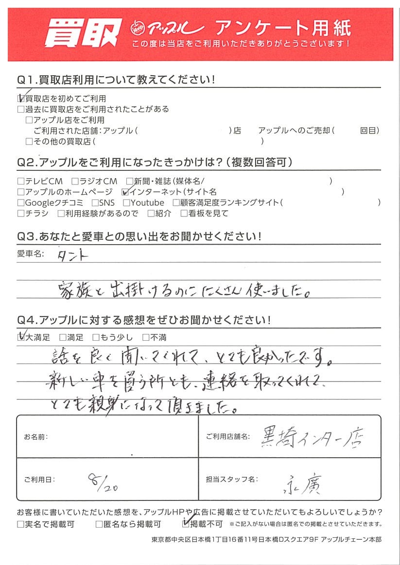 お車のご相談・ 査定だけでもOK! カンタン 入力 30秒 アップルがブランド買取始めました! お電話でも受付中! 受付時間10:00 ~ 18:30 0120-556-522 お車のご相談・ 査定だけでもOK! カンタン 入力 30秒 アップルがブランド買取始めました! お電話でも受付中! 受付時間10:00 ~ 18:30 0120-556-522 アップルがブランド買取始めました! お電話でも受付中! 受付時間10:00 ~ 18:30 0120-556-522 店舗情報 在庫車 スタッフ紹介 ブログ お客様の声 キャンペーン お得 無料査定 click お客様の声 ご記入日: 2022/08/20 新潟県新潟市 K様 車名:ダイハツ タント Q3.あなたと愛車との思い出をお聞かせください!タント家族と出掛けるのにたくさん使いました。Q4.アップルに対する感想をぜひお聞かせください!話を良く聞いてくれて、とても良かったです。新しい車を買う所とも、連絡を取ってくれてとても親身になって頂きました。 前へ 次へ お客様の声一覧を見る
