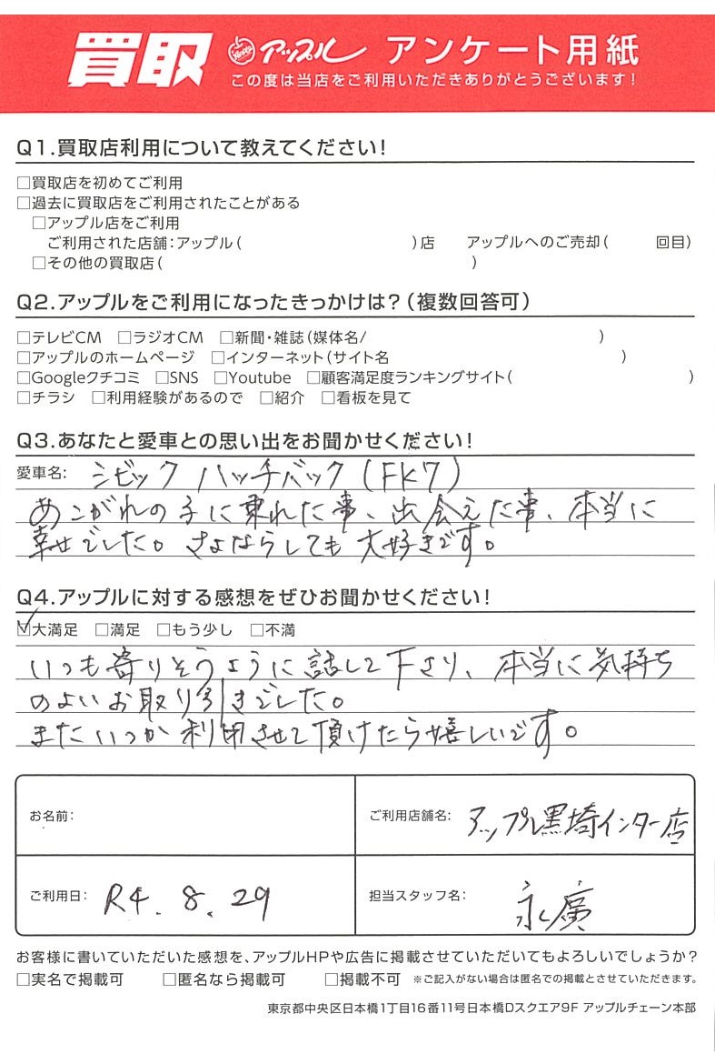 新潟県 N様 車名:ホンダ シビックハッチバック