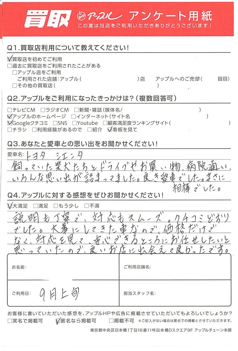新潟県 K様 車名:トヨタ シエンタ