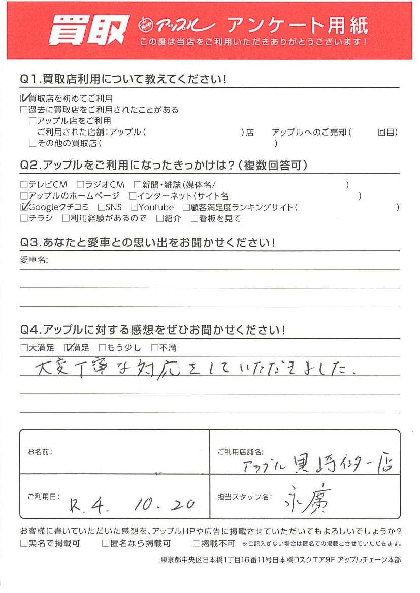 お車のご相談・ 査定だけでもOK! カンタン 入力 30秒 アップルがブランド買取始めました! お電話でも受付中! 受付時間10:00 ~ 18:30 0120-556-522 お車のご相談・ 査定だけでもOK! カンタン 入力 30秒 アップルがブランド買取始めました! お電話でも受付中! 受付時間10:00 ~ 18:30 0120-556-522 アップルがブランド買取始めました! お電話でも受付中! 受付時間10:00 ~ 18:30 0120-556-522 店舗情報 在庫車 スタッフ紹介 ブログ お客様の声 キャンペーン お得 無料査定 click お客様の声 ご記入日: 2022/10/20 K様 Q4.アップルに対する感想をぜひお聞かせ下さい!大変丁寧な対応をしていただきました。 前へ 次へ お客様の声一覧を見る