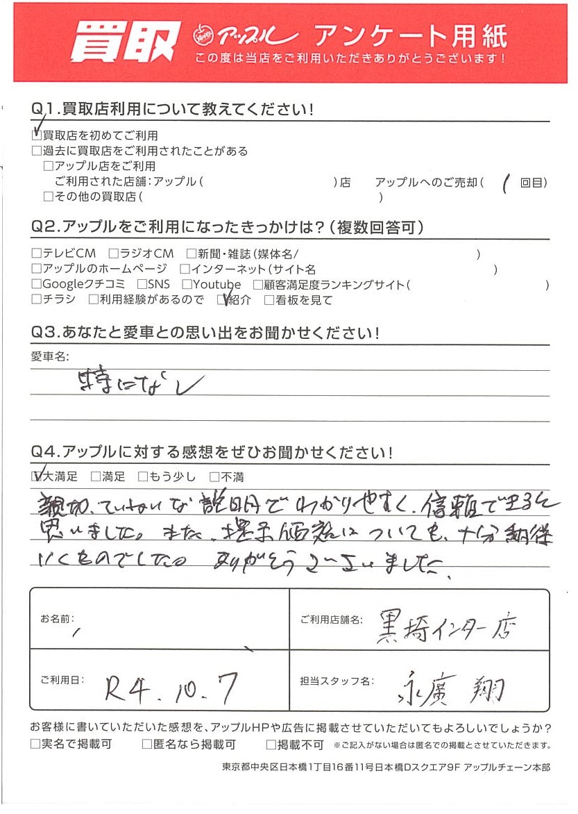 お車のご相談・ 査定だけでもOK! カンタン 入力 30秒 アップルがブランド買取始めました! お電話でも受付中! 受付時間10:00 ~ 18:30 0120-556-522 お車のご相談・ 査定だけでもOK! カンタン 入力 30秒 アップルがブランド買取始めました! お電話でも受付中! 受付時間10:00 ~ 18:30 0120-556-522 アップルがブランド買取始めました! お電話でも受付中! 受付時間10:00 ~ 18:30 0120-556-522 店舗情報 在庫車 スタッフ紹介 ブログ お客様の声 キャンペーン お得 無料査定 click お客様の声 ご記入日: 2022/10/07 K様 Q3.あなたと愛車との思い出をお聞かせください!特になしQ4.アップルに対する感想をぜひお聞かせください!親切、ていねいな説明でわかりやすく、信頼できると思いました。また、提示価格についても十分納得いくものでした。ありがとうございました。 前へ 次へ お客様の声一覧を見る