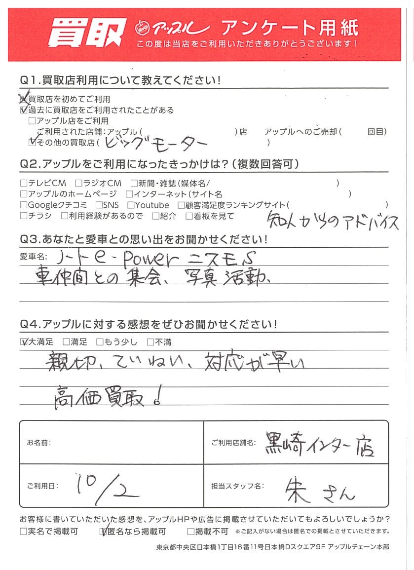 お車のご相談・ 査定だけでもOK! カンタン 入力 30秒 アップルがブランド買取始めました! お電話でも受付中! 受付時間10:00 ~ 18:30 0120-556-522 お車のご相談・ 査定だけでもOK! カンタン 入力 30秒 アップルがブランド買取始めました! お電話でも受付中! 受付時間10:00 ~ 18:30 0120-556-522 アップルがブランド買取始めました! お電話でも受付中! 受付時間10:00 ~ 18:30 0120-556-522 店舗情報 在庫車 スタッフ紹介 ブログ お客様の声 キャンペーン お得 無料査定 click お客様の声 ご記入日: 2022/10/02 O様 車名:日産 ノート Q3.あなたと愛車との思い出をお聞かせください!ノートe-power ニスモS車仲間との集会、写真活動Q4.アップルに対する感想をぜひお聞かせください親切、ていねい、対応が早い高価買取! 前へ 次へ お客様の声一覧を見る