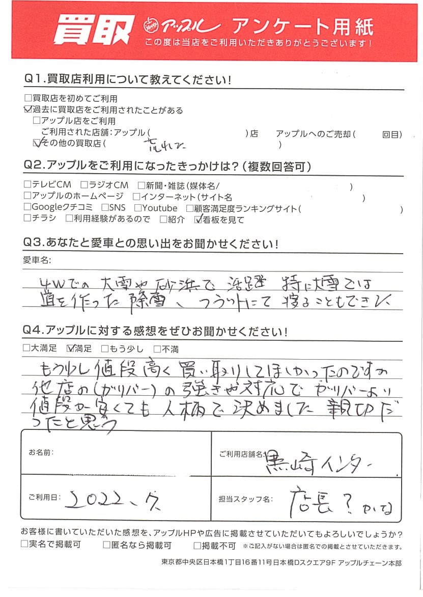 もう少し値段高く買取してほしかったのですが、他店(ガリバー)の強気な対応でガリバーより値段が安くても人柄で決めました。親切だったと思う。