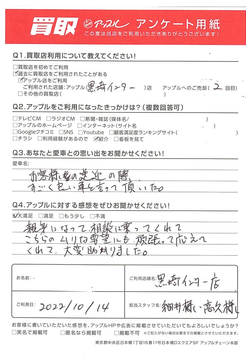 お車のご相談・ 査定だけでもOK! カンタン 入力 30秒 アップルがブランド買取始めました! お電話でも受付中! 受付時間10:00 ~ 18:30 0120-556-522 お車のご相談・ 査定だけでもOK! カンタン 入力 30秒 アップルがブランド買取始めました! お電話でも受付中! 受付時間10:00 ~ 18:30 0120-556-522 アップルがブランド買取始めました! お電話でも受付中! 受付時間10:00 ~ 18:30 0120-556-522 店舗情報 在庫車 スタッフ紹介 ブログ お客様の声 キャンペーン お得 無料査定 click お客様の声 ご記入日: 2022/10/14 T様 Q3.あなたと愛車との思い出をお聞かせください!お客様の送迎の際、すごく良い車と言っていただいた。Q4.アップルに対する感想をぜひお聞かせください!親身になって、相談に乗ってくれてこちらのムリな要望にも頑張って応えてくれて、大変助かりました。 前へ 次へ お客様の声一覧を見る