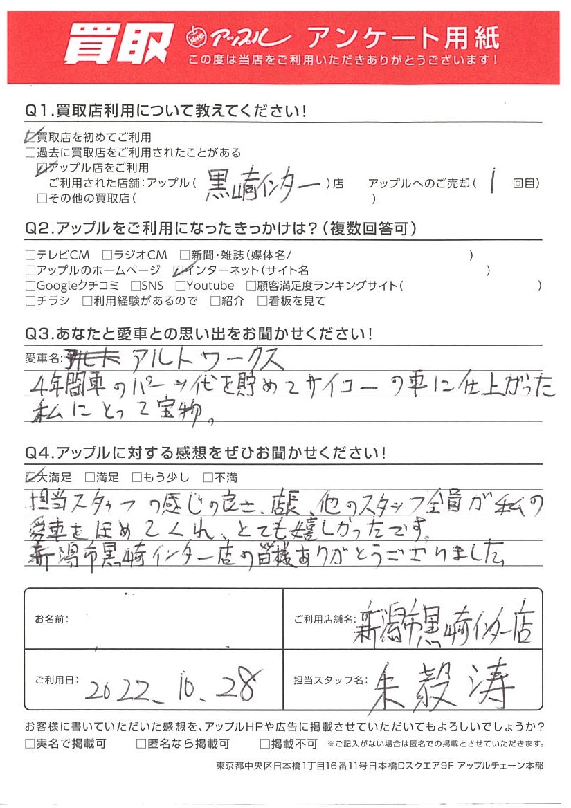 担当スタッフの感じの良さ、店長、他のスタッフ全員が私の愛車をほめてくれ、とても嬉しかったです。新潟市黒埼インター店の皆様ありがとうございました。