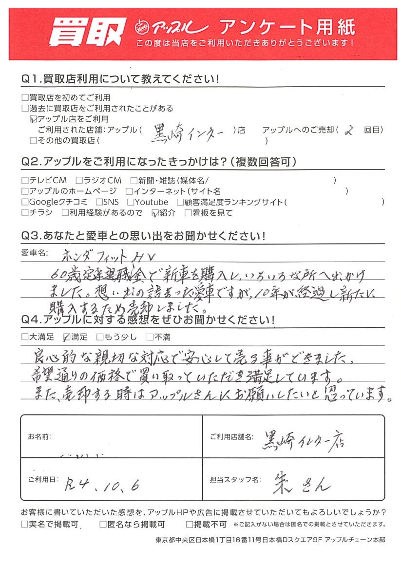 良心的な親切な対応で安心して売る事が出来ました。希望通りの価格で買い取っていただき満足しています。また、売却する時はアップルさんにお願いしたいと思っています。