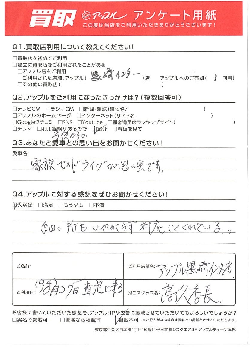 お車のご相談・ 査定だけでもOK! カンタン 入力 30秒 アップルがブランド買取始めました! お電話でも受付中! 受付時間10:00 ~ 18:30 0120-556-522 お車のご相談・ 査定だけでもOK! カンタン 入力 30秒 アップルがブランド買取始めました! お電話でも受付中! 受付時間10:00 ~ 18:30 0120-556-522 アップルがブランド買取始めました! お電話でも受付中! 受付時間10:00 ~ 18:30 0120-556-522 店舗情報 在庫車 スタッフ紹介 ブログ お客様の声 キャンペーン お得 無料査定 click お客様の声 ご記入日: -/-/- T様 Q3.あなたと愛車との思い出をお聞かせください!家族でのドライブが思い出です。Q4.アップルに対する感想をぜひお聞かせください!細かい所もいやがらず対応してくれている。 前へ 次へ お客様の声一覧を見る