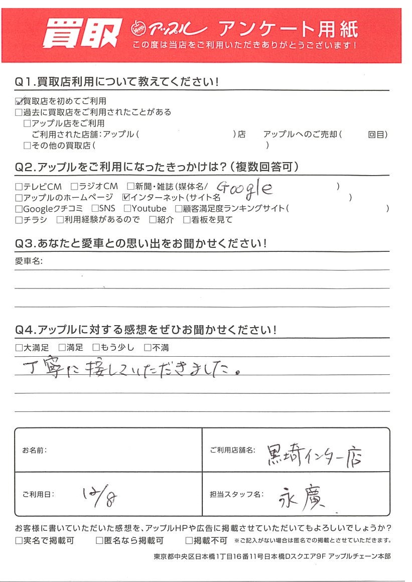 お車のご相談・ 査定だけでもOK! カンタン 入力 30秒 アップルがブランド買取始めました! お電話でも受付中! 受付時間10:00 ~ 18:30 0120-556-522 お車のご相談・ 査定だけでもOK! カンタン 入力 30秒 アップルがブランド買取始めました! お電話でも受付中! 受付時間10:00 ~ 18:30 0120-556-522 アップルがブランド買取始めました! お電話でも受付中! 受付時間10:00 ~ 18:30 0120-556-522 店舗情報 在庫車 スタッフ紹介 ブログ お客様の声 キャンペーン お得 無料査定 click お客様の声 ご記入日: 2022/12/08 匿名様 Q3.あなたと愛車との思い出をお聞かせくださいQ4.アップルに対する感想をぜひお聞かせください!丁寧に接していただきました。 前へ 次へ お客様の声一覧を見る