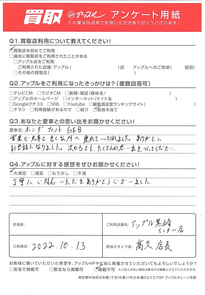 N様 車名:ホンダ フィット(H25年9月以降のハイブリッド含む)
