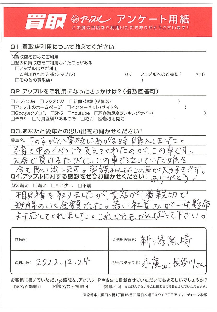 相見積を取りましたが、貴店が一番親切で納得のいく金額でした。若い社員さんが一生懸命対応してくれました。これからもがんばってください。