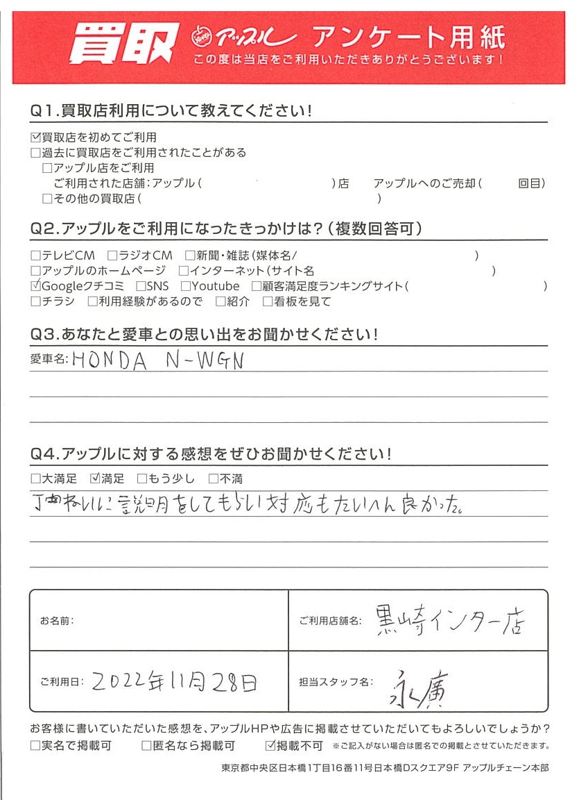 お車のご相談・ 査定だけでもOK! カンタン 入力 30秒 アップルがブランド買取始めました! お電話でも受付中! 受付時間10:00 ~ 18:30 0120-556-522 お車のご相談・ 査定だけでもOK! カンタン 入力 30秒 アップルがブランド買取始めました! お電話でも受付中! 受付時間10:00 ~ 18:30 0120-556-522 アップルがブランド買取始めました! お電話でも受付中! 受付時間10:00 ~ 18:30 0120-556-522 店舗情報 在庫車 スタッフ紹介 ブログ お客様の声 キャンペーン お得 無料査定 click お客様の声 ご記入日: 2022/12/28 T様 車名:ホンダ N-WGN Q3.あなたと愛車との思い出をお聞かせください!HONDA N-WGNQ4.アップルに対する感想をぜひお聞かせください!丁寧に説明をしてもらい対応もたいへん良かった。 前へ 次へ お客様の声一覧を見る