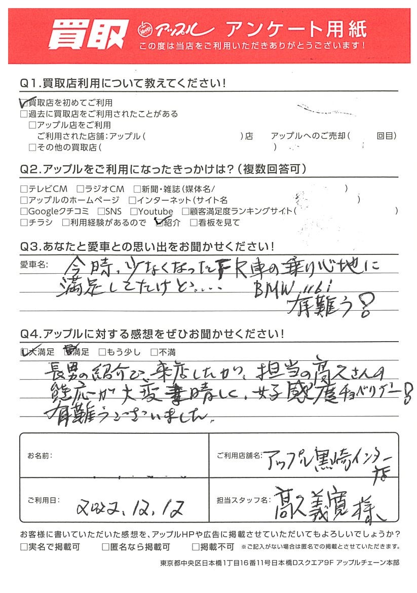 お車のご相談・ 査定だけでもOK! カンタン 入力 30秒 アップルがブランド買取始めました! お電話でも受付中! 受付時間10:00 ~ 18:30 0120-556-522 お車のご相談・ 査定だけでもOK! カンタン 入力 30秒 アップルがブランド買取始めました! お電話でも受付中! 受付時間10:00 ~ 18:30 0120-556-522 アップルがブランド買取始めました! お電話でも受付中! 受付時間10:00 ~ 18:30 0120-556-522 店舗情報 在庫車 スタッフ紹介 ブログ お客様の声 キャンペーン お得 無料査定 click お客様の声 ご記入日: 2022/12/12 H様 車名:BMW 1シリーズ Q3.あなたと愛車との思い出をお聞かせください!今時、少なくなったFR車の乗り心地に満足してたけど、、、BMW116i有難う!Q4.アップルに対する感想をぜひお聞かせください!長男の紹介で来店し、担当の髙久さんの対応が大変素晴らしく、好感度チョベリグー!ありがとうございました。 前へ 次へ お客様の声一覧を見る
