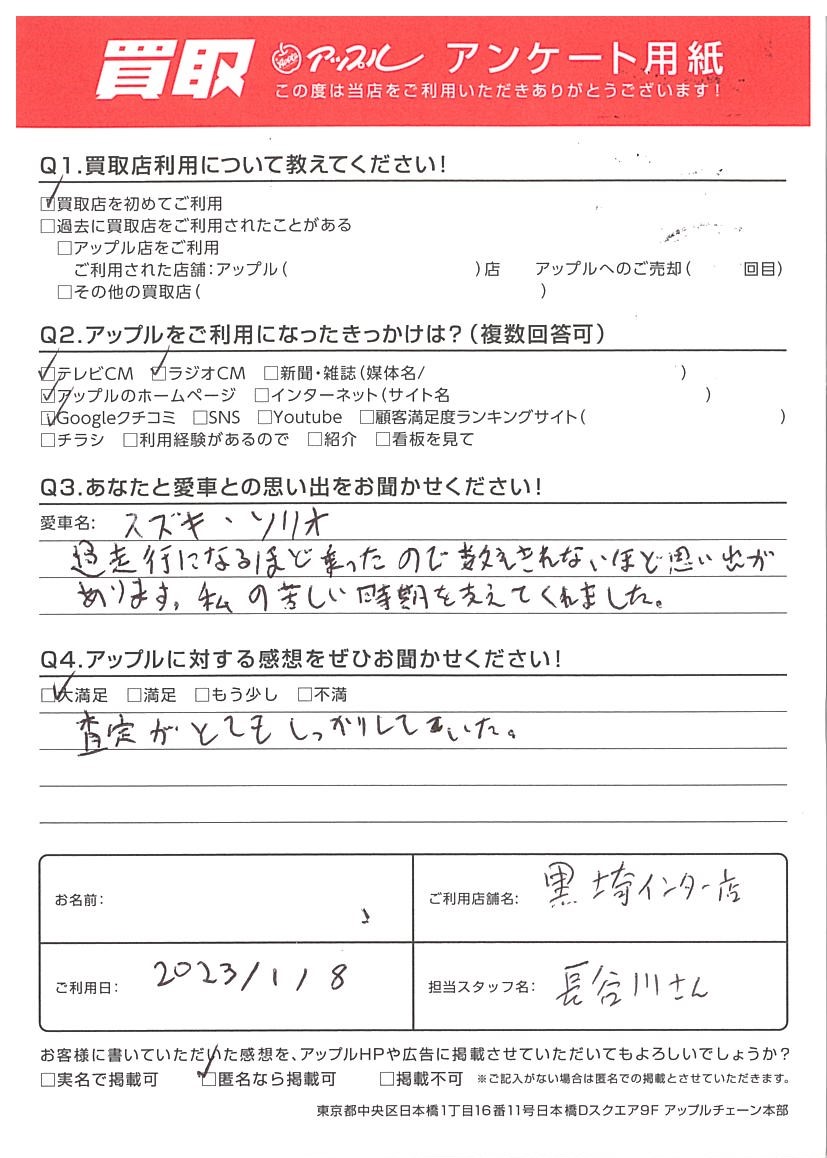 お車のご相談・ 査定だけでもOK! カンタン 入力 30秒 アップルがブランド買取始めました! お電話でも受付中! 受付時間10:00 ~ 18:30 0120-556-522 お車のご相談・ 査定だけでもOK! カンタン 入力 30秒 アップルがブランド買取始めました! お電話でも受付中! 受付時間10:00 ~ 18:30 0120-556-522 アップルがブランド買取始めました! お電話でも受付中! 受付時間10:00 ~ 18:30 0120-556-522 店舗情報 在庫車 スタッフ紹介 ブログ お客様の声 キャンペーン お得 無料査定 click お客様の声 ご記入日: 2023/01/08 新潟県 K様 車名:スズキ ソリオ Q3.あなたと愛車との思い出をお聞かせください!スズキ ソリオ過走行になるほど乗ったので数えきれないほどの思い出があります。私の苦しい時期を支えてくれました。Q4.アップルに対する感想をぜひお聞かせください!査定がとてもしっかりしていた。 前へ 次へ お客様の声一覧を見る