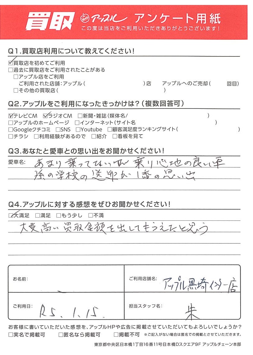 お車のご相談・ 査定だけでもOK! カンタン 入力 30秒 アップルがブランド買取始めました! お電話でも受付中! 受付時間10:00 ~ 18:30 0120-556-522 お車のご相談・ 査定だけでもOK! カンタン 入力 30秒 アップルがブランド買取始めました! お電話でも受付中! 受付時間10:00 ~ 18:30 0120-556-522 アップルがブランド買取始めました! お電話でも受付中! 受付時間10:00 ~ 18:30 0120-556-522 店舗情報 在庫車 スタッフ紹介 ブログ お客様の声 キャンペーン お得 無料査定 click お客様の声 ご記入日: 2023/01/15 新潟県 W様 Q3.あなたと愛車との思い出をお聞かせください!あまり乗ってない、乗り心地の良い車孫の学校の送迎が一番の思い出Q4.アップルに対する感想をぜひお聞かせください!大変高い買取金額を出してもらえたと思う 前へ 次へ お客様の声一覧を見る