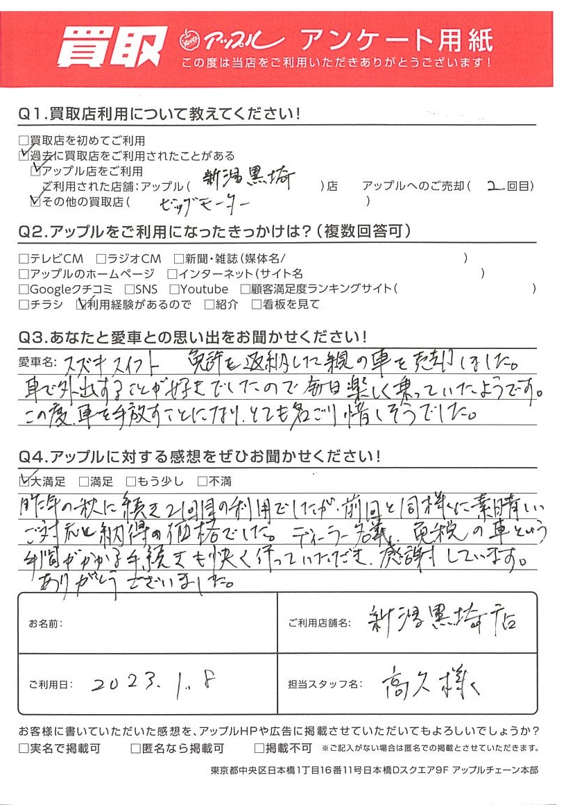 免許を返納した親の車を売却しました。車で外出することが好きでしたので毎日楽しく乗っていたようです。この度、車を手放すことになり、とても名残りおしそうでした。