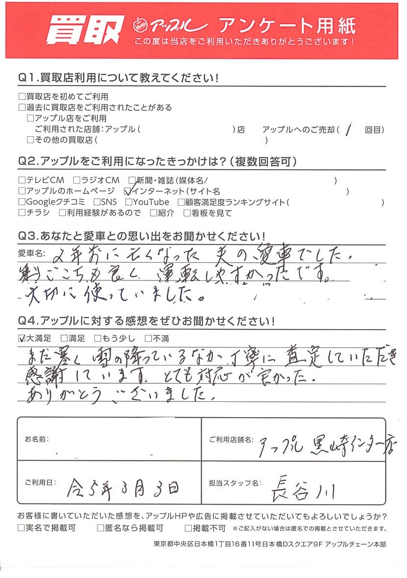 お車のご相談・ 査定だけでもOK! カンタン 入力 30秒 アップルがブランド買取始めました! お電話でも受付中! 受付時間10:00 ~ 18:30 0120-556-522 お車のご相談・ 査定だけでもOK! カンタン 入力 30秒 アップルがブランド買取始めました! お電話でも受付中! 受付時間10:00 ~ 18:30 0120-556-522 アップルがブランド買取始めました! お電話でも受付中! 受付時間10:00 ~ 18:30 0120-556-522 店舗情報 在庫車 スタッフ紹介 ブログ お客様の声 キャンペーン お得 無料査定 click お客様の声 ご記入日: 2023/03/03 M様 Q3.あなたと愛車との思い出をお聞かせください!2年前に亡くなった夫の愛車でした。乗り心地も良く、運転しやすかったです。大切に使っていました。Q4.アップルに対する感想をぜひお聞かせください!まだ寒く雪の降っているなか、丁寧に査定していただき感謝しています。とても対応が良かった。ありがとうございました。 前へ 次へ お客様の声一覧を見る