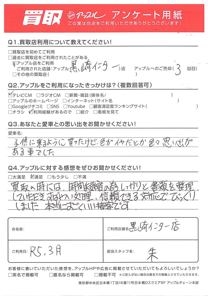 お車のご相談・ 査定だけでもOK! カンタン 入力 30秒 アップルがブランド買取始めました! お電話でも受付中! 受付時間10:00 ~ 18:30 0120-556-522 お車のご相談・ 査定だけでもOK! カンタン 入力 30秒 アップルがブランド買取始めました! お電話でも受付中! 受付時間10:00 ~ 18:30 0120-556-522 アップルがブランド買取始めました! お電話でも受付中! 受付時間10:00 ~ 18:30 0120-556-522 店舗情報 在庫車 スタッフ紹介 ブログ お客様の声 キャンペーン お得 無料査定 click お客様の声 ご記入日: 2023/03/01 K様 Q3.あなたと愛車との思い出をお聞かせください!子供に乗るように買ったけど、色がイヤだとか色々思い出がある車でした。Q4.アップルに対する感想をぜひお聞かせください!買取の時には、時間短縮の為しっかりと書類を整理していただきすばやい処理、信頼できる対応でびっくりしました。本当にすごくいい接客です。 前へ 次へ お客様の声一覧を見る