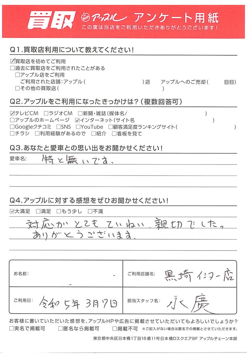 お車のご相談・ 査定だけでもOK! カンタン 入力 30秒 アップルがブランド買取始めました! お電話でも受付中! 受付時間10:00 ~ 18:30 0120-556-522 お車のご相談・ 査定だけでもOK! カンタン 入力 30秒 アップルがブランド買取始めました! お電話でも受付中! 受付時間10:00 ~ 18:30 0120-556-522 アップルがブランド買取始めました! お電話でも受付中! 受付時間10:00 ~ 18:30 0120-556-522 店舗情報 在庫車 スタッフ紹介 ブログ お客様の声 キャンペーン お得 無料査定 click お客様の声 ご記入日: 2023/03/07 M様 Q3.あなたと愛車との思い出をお聞かせください!特と無いです。Q4.アップルに対する感想をぜひお聞かせください!対応がとてもていねい、親切でした。ありがとうございます。 前へ 次へ お客様の声一覧を見る