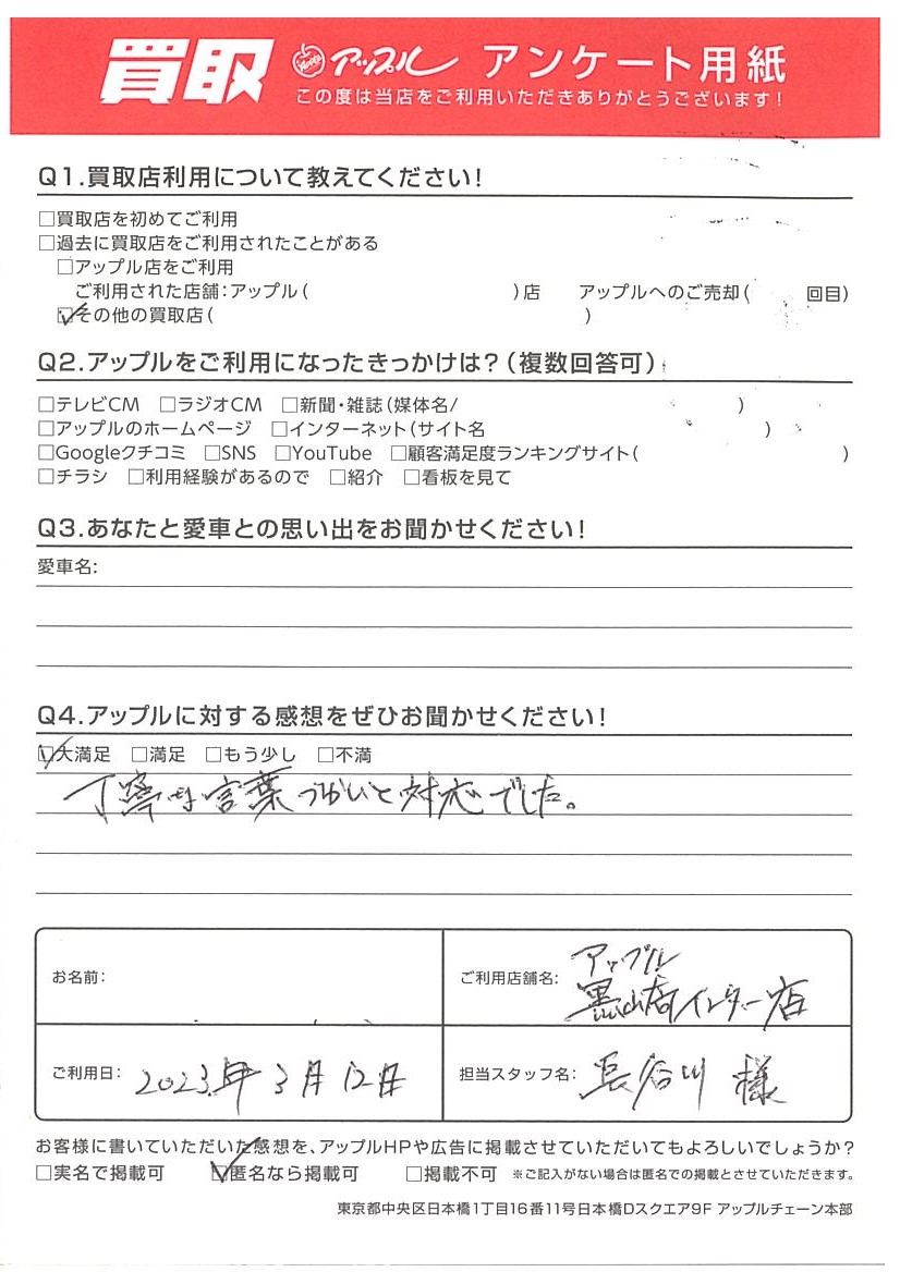 お車のご相談・ 査定だけでもOK! カンタン 入力 30秒 アップルがブランド買取始めました! お電話でも受付中! 受付時間10:00 ~ 18:30 0120-556-522 お車のご相談・ 査定だけでもOK! カンタン 入力 30秒 アップルがブランド買取始めました! お電話でも受付中! 受付時間10:00 ~ 18:30 0120-556-522 アップルがブランド買取始めました! お電話でも受付中! 受付時間10:00 ~ 18:30 0120-556-522 店舗情報 在庫車 スタッフ紹介 ブログ お客様の声 キャンペーン お得 無料査定 click お客様の声 ご記入日: 2023/03/12 S様 Q3.あなたと愛車との思い出をお聞かせください!Q4.アップルに対する感想をぜひお聞かせください!丁寧な言葉づかいと対応でした。 前へ 次へ お客様の声一覧を見る