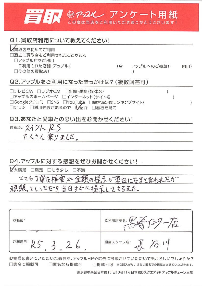 お車のご相談・ 査定だけでもOK! カンタン 入力 30秒 アップルがブランド買取始めました! お電話でも受付中! 受付時間10:00 ~ 18:30 0120-556-522 お車のご相談・ 査定だけでもOK! カンタン 入力 30秒 アップルがブランド買取始めました! お電話でも受付中! 受付時間10:00 ~ 18:30 0120-556-522 アップルがブランド買取始めました! お電話でも受付中! 受付時間10:00 ~ 18:30 0120-556-522 店舗情報 在庫車 スタッフ紹介 ブログ お客様の声 キャンペーン お得 無料査定 click お客様の声 ご記入日: 2023/03/26 J様 Q3.あなたと愛車との思い出をお聞かせください!スイフトRSQ4.アップルに対する感想をぜひお聞かせください!とても丁寧な接客で金額の提示が翌日になると言われたが頑張っていただき当日すぐに提示してもらえた。 前へ 次へ お客様の声一覧を見る