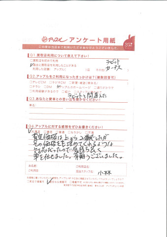 お車のご相談・ 査定だけでもOK! カンタン 入力 30秒 アップルがブランド買取始めました! お電話でも受付中! 受付時間10:00 ~ 18:30 0120-556-522 お車のご相談・ 査定だけでもOK! カンタン 入力 30秒 アップルがブランド買取始めました! お電話でも受付中! 受付時間10:00 ~ 18:30 0120-556-522 アップルがブランド買取始めました! お電話でも受付中! 受付時間10:00 ~ 18:30 0120-556-522 店舗情報 在庫車 スタッフ紹介 ブログ お客様の声 キャンペーン お得 無料査定 click お客様の声 ご記入日: 2014/12/26 匿名希望様 査定価格は上から2番目でしたが、その価格をも埋めてくれるような対応だったので気持ち良く車を任せました。有難うございました。 前へ 次へ お客様の声一覧を見る