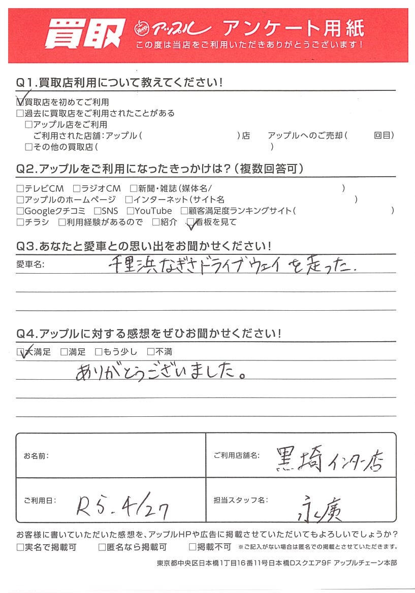 お車のご相談・ 査定だけでもOK! カンタン 入力 30秒 アップルがブランド買取始めました! お電話でも受付中! 受付時間10:00 ~ 18:30 0120-556-522 お車のご相談・ 査定だけでもOK! カンタン 入力 30秒 アップルがブランド買取始めました! お電話でも受付中! 受付時間10:00 ~ 18:30 0120-556-522 アップルがブランド買取始めました! お電話でも受付中! 受付時間10:00 ~ 18:30 0120-556-522 店舗情報 在庫車 スタッフ紹介 ブログ お客様の声 キャンペーン お得 無料査定 click お客様の声 ご記入日: 2023/04/27 A様 Q3.あなたと愛車との思い出をお聞かせください!千里浜なぎさドライブウェイを走ったQ4.アップルに対する感想をぜひお聞かせください!ありがとうございました。 前へ 次へ お客様の声一覧を見る