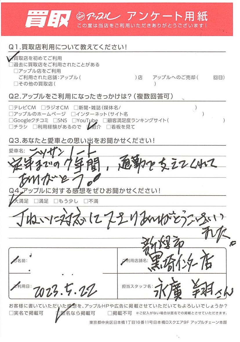 お車のご相談・ 査定だけでもOK! カンタン 入力 30秒 アップルがブランド買取始めました! お電話でも受付中! 受付時間10:00 ~ 18:30 0120-556-522 お車のご相談・ 査定だけでもOK! カンタン 入力 30秒 アップルがブランド買取始めました! お電話でも受付中! 受付時間10:00 ~ 18:30 0120-556-522 アップルがブランド買取始めました! お電話でも受付中! 受付時間10:00 ~ 18:30 0120-556-522 店舗情報 在庫車 スタッフ紹介 ブログ お客様の声 キャンペーン お得 無料査定 click お客様の声 ご記入日: 2023/05/22 H様 車名:日産 ノート Q3.あなたと愛車との思い出をお聞かせください!日産 ノート定年までの7年間、通勤を支えてくれてありがとう!Q4.アップルに対する感想をぜひお聞かせください!丁寧に対応して下さりありがとうございました。 前へ 次へ お客様の声一覧を見る