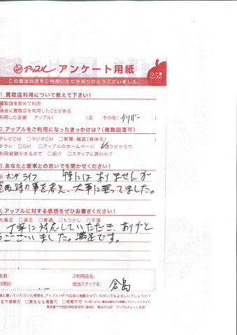 お車のご相談・ 査定だけでもOK! カンタン 入力 30秒 アップルがブランド買取始めました! お電話でも受付中! 受付時間10:00 ~ 18:30 0120-556-522 お車のご相談・ 査定だけでもOK! カンタン 入力 30秒 アップルがブランド買取始めました! お電話でも受付中! 受付時間10:00 ~ 18:30 0120-556-522 アップルがブランド買取始めました! お電話でも受付中! 受付時間10:00 ~ 18:30 0120-556-522 店舗情報 在庫車 スタッフ紹介 ブログ お客様の声 キャンペーン お得 無料査定 click お客様の声 ご記入日: 2015/01/26 E様 丁寧に対応していただき、ありがとうございました。満足です。 前へ 次へ お客様の声一覧を見る