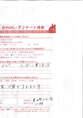 お車のご相談・ 査定だけでもOK! カンタン 入力 30秒 アップルがブランド買取始めました! お電話でも受付中! 受付時間10:00 ~ 18:30 0120-556-522 お車のご相談・ 査定だけでもOK! カンタン 入力 30秒 アップルがブランド買取始めました! お電話でも受付中! 受付時間10:00 ~ 18:30 0120-556-522 アップルがブランド買取始めました! お電話でも受付中! 受付時間10:00 ~ 18:30 0120-556-522 店舗情報 在庫車 スタッフ紹介 ブログ お客様の声 キャンペーン お得 無料査定 click お客様の声 ご記入日: 2015/02/13 匿名様 親切に気持ちよく応対下さいました。 前へ 次へ お客様の声一覧を見る