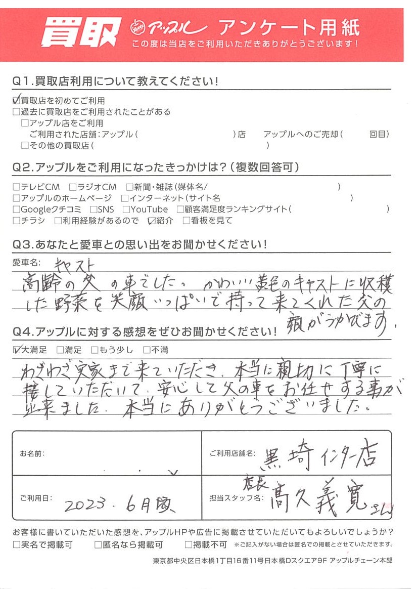 わざわざ実家まで来ていただき、本当に親切に丁寧に接していただいて、安心して父の車をお任せする事が出来ました。本当にありがとうございました。