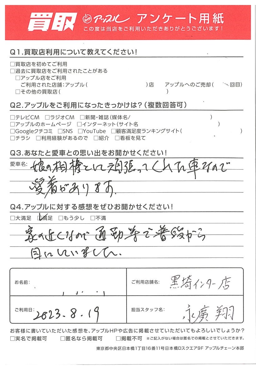 お車のご相談・ 査定だけでもOK! カンタン 入力 30秒 アップルがブランド買取始めました! お電話でも受付中! 受付時間10:00 ~ 18:30 0120-556-522 お車のご相談・ 査定だけでもOK! カンタン 入力 30秒 アップルがブランド買取始めました! お電話でも受付中! 受付時間10:00 ~ 18:30 0120-556-522 アップルがブランド買取始めました! お電話でも受付中! 受付時間10:00 ~ 18:30 0120-556-522 店舗情報 在庫車 スタッフ紹介 ブログ お客様の声 キャンペーン お得 無料査定 click お客様の声 ご記入日: 2023/08/19 o様 Q3.あなたと愛車との思い出をお聞かせください!娘の相棒として頑張ってくれた車なので愛着があります。Q4.アップルに対する感想をぜひお聞かせください!家の近くなので通勤等で普段から目にしていました。 前へ 次へ お客様の声一覧を見る