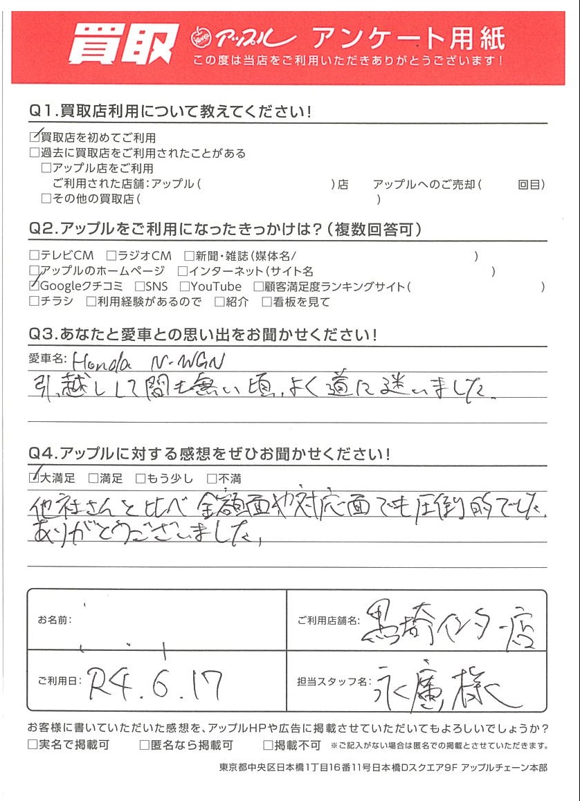お車のご相談・ 査定だけでもOK! カンタン 入力 30秒 アップルがブランド買取始めました! お電話でも受付中! 受付時間10:00 ~ 18:30 0120-556-522 お車のご相談・ 査定だけでもOK! カンタン 入力 30秒 アップルがブランド買取始めました! お電話でも受付中! 受付時間10:00 ~ 18:30 0120-556-522 アップルがブランド買取始めました! お電話でも受付中! 受付時間10:00 ~ 18:30 0120-556-522 店舗情報 在庫車 スタッフ紹介 ブログ お客様の声 キャンペーン お得 無料査定 click お客様の声 ご記入日: 2023/06/17 I様 車名:ホンダ N-WGN Q3.あなたと愛車との思い出をお聞かせください!Honda N-WGN引っ越しして間もない頃、よく道に迷いました。Q4.アップルに対する感想をぜひお聞かせください!他社さんと比べ金額面や対応面でも圧倒的でした。ありがとうございました。 前へ 次へ お客様の声一覧を見る