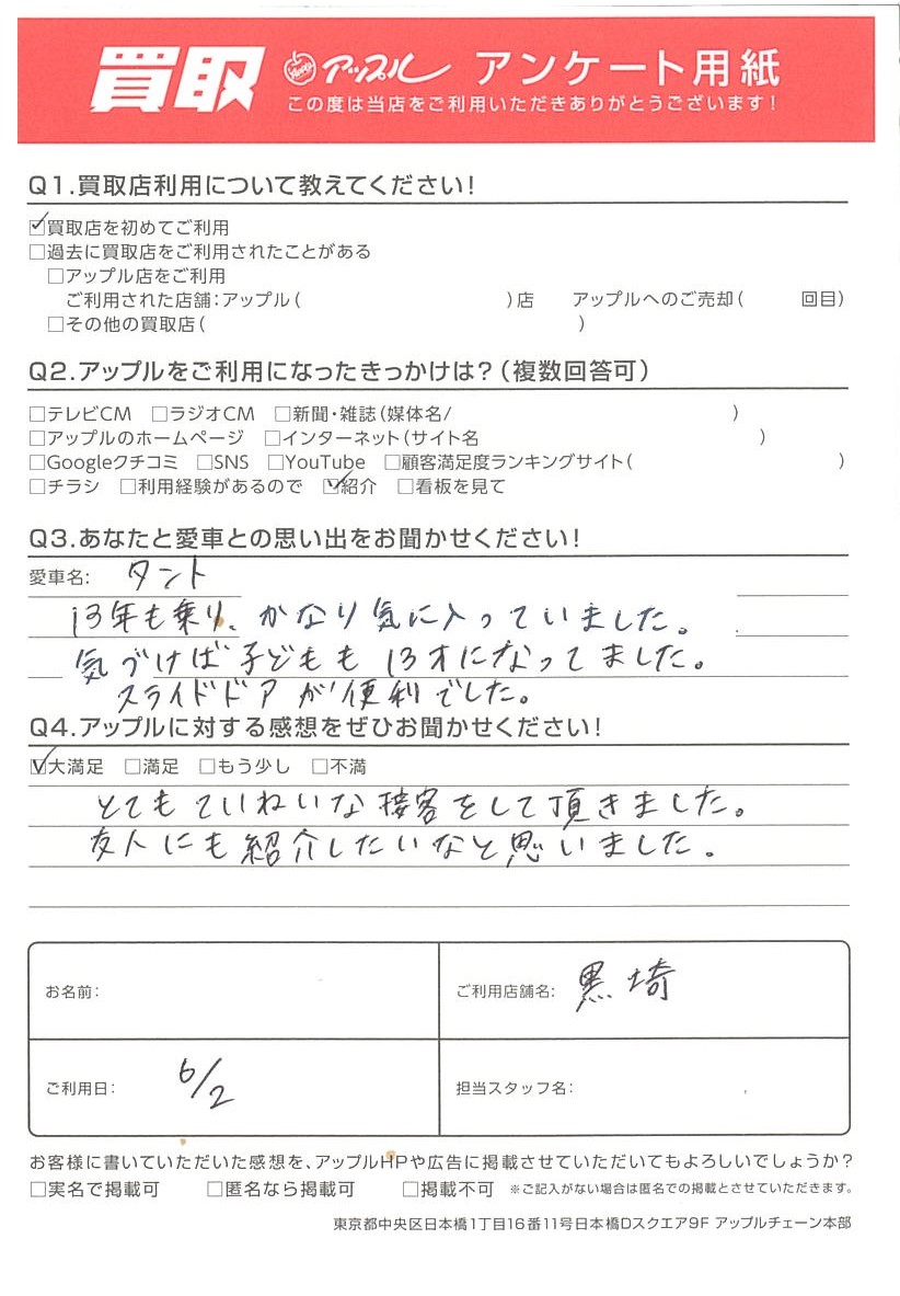 お車のご相談・ 査定だけでもOK! カンタン 入力 30秒 アップルがブランド買取始めました! お電話でも受付中! 受付時間10:00 ~ 18:30 0120-556-522 お車のご相談・ 査定だけでもOK! カンタン 入力 30秒 アップルがブランド買取始めました! お電話でも受付中! 受付時間10:00 ~ 18:30 0120-556-522 アップルがブランド買取始めました! お電話でも受付中! 受付時間10:00 ~ 18:30 0120-556-522 店舗情報 在庫車 スタッフ紹介 ブログ お客様の声 キャンペーン お得 無料査定 click お客様の声 ご記入日: 2023/06/02 O様 車名:ダイハツ タント Q3.あなたと愛車との思い出をお聞かせください!タント13年も乗り、かなり気に入っていました。気づけば子どもも13才になっていました。スライドドアが便利でした。Q4.アップルに対する感想をぜひお聞かせください!とてもていねいな接客をして頂きました。友人にも紹介したいなと思いました。 前へ 次へ お客様の声一覧を見る