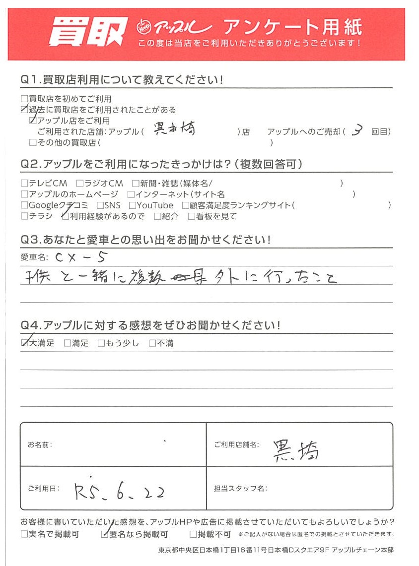 お車のご相談・ 査定だけでもOK! カンタン 入力 30秒 アップルがブランド買取始めました! お電話でも受付中! 受付時間10:00 ~ 18:30 0120-556-522 お車のご相談・ 査定だけでもOK! カンタン 入力 30秒 アップルがブランド買取始めました! お電話でも受付中! 受付時間10:00 ~ 18:30 0120-556-522 アップルがブランド買取始めました! お電話でも受付中! 受付時間10:00 ~ 18:30 0120-556-522 店舗情報 在庫車 スタッフ紹介 ブログ お客様の声 キャンペーン お得 無料査定 click お客様の声 ご記入日: 2023/06/22 E様 車名:マツダ CX-5 Q3.あなたと愛車との思い出をお聞かせください!CX-5子供と一緒に複数の県外へ行ったことQ4.アップルに対する感想をぜひお聞かせください! 前へ 次へ お客様の声一覧を見る