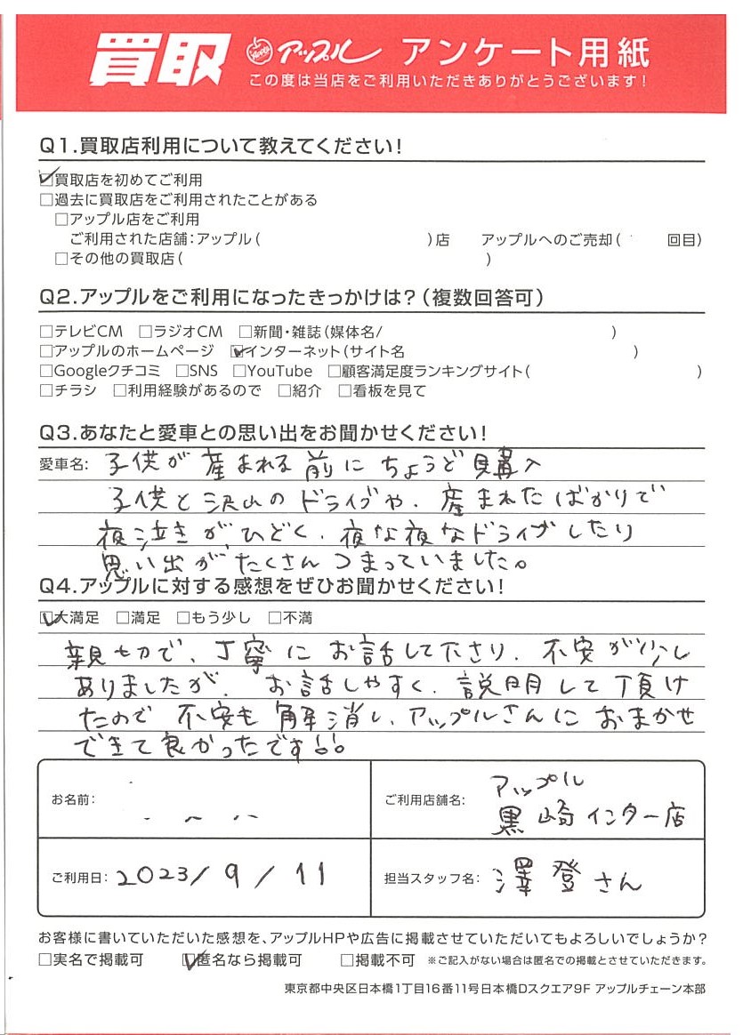 子供が産まれる前にちょうど購入 子供と沢山のドライブや、産まれたばかりで夜泣きがひどく、夜な夜なドライブしたり思い出がたくさんつまっていました。