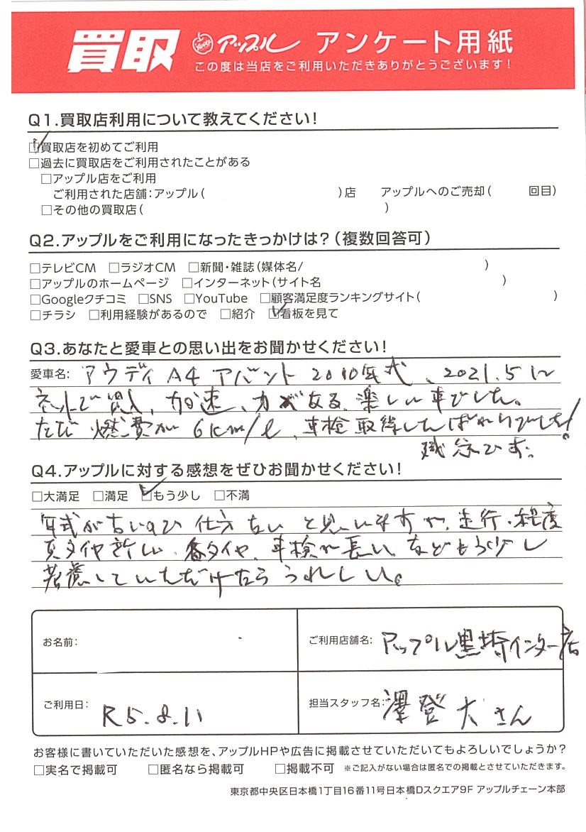 アウディ A4 アバント 2010年式 2021.5月にネットで購入。加速力がある楽しい車でした。 ただ、燃費が6km/L、車検取得したばかりでした!残念です。
