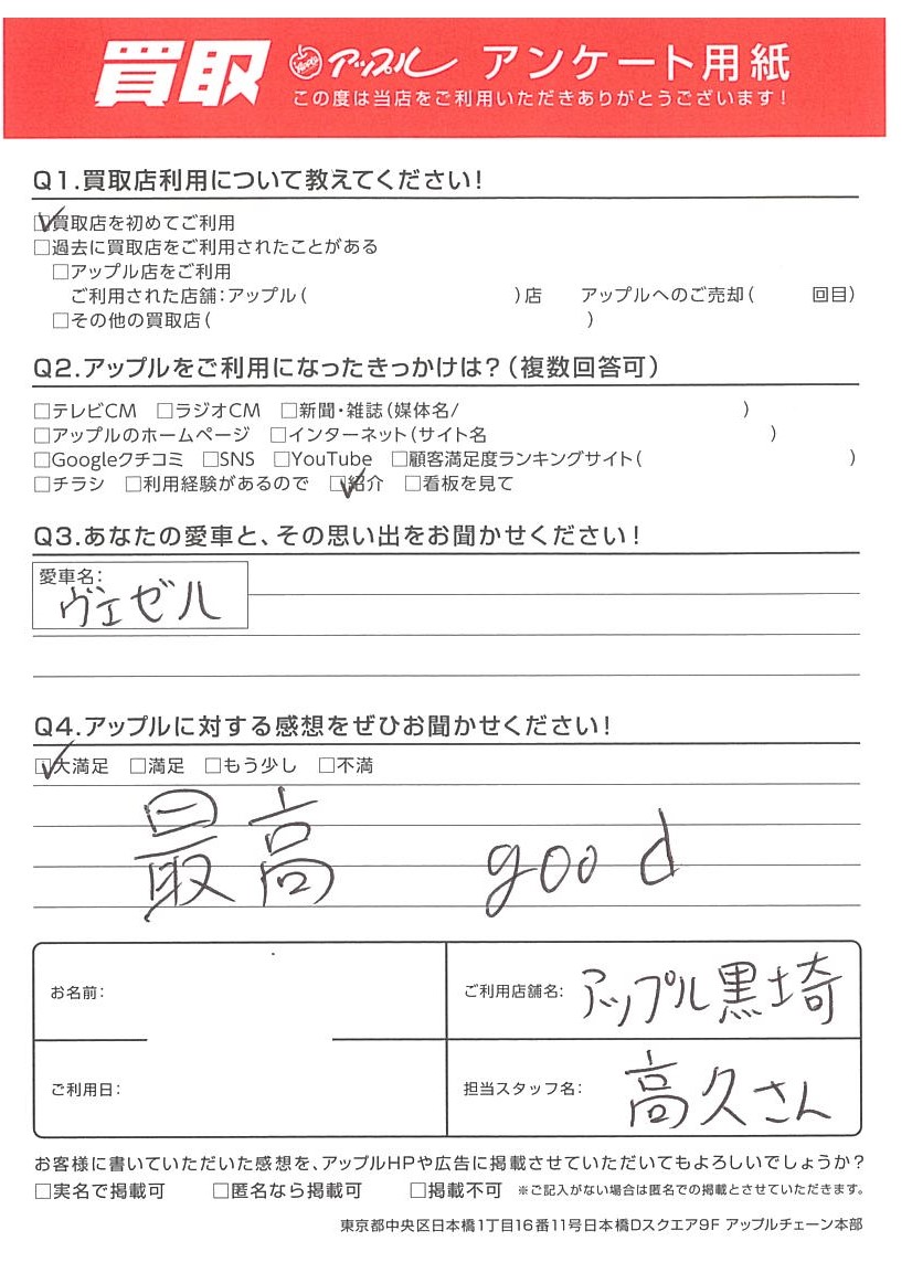 お車のご相談・ 査定だけでもOK! カンタン 入力 30秒 アップルがブランド買取始めました! お電話でも受付中! 受付時間10:00 ~ 18:30 0120-556-522 お車のご相談・ 査定だけでもOK! カンタン 入力 30秒 アップルがブランド買取始めました! お電話でも受付中! 受付時間10:00 ~ 18:30 0120-556-522 アップルがブランド買取始めました! お電話でも受付中! 受付時間10:00 ~ 18:30 0120-556-522 店舗情報 在庫車 スタッフ紹介 ブログ お客様の声 キャンペーン お得 無料査定 click お客様の声 ご記入日: 2024/09/25 匿名希望様 車名:ホンダ ヴェゼル 最高 good 前へ 次へ お客様の声一覧を見る
